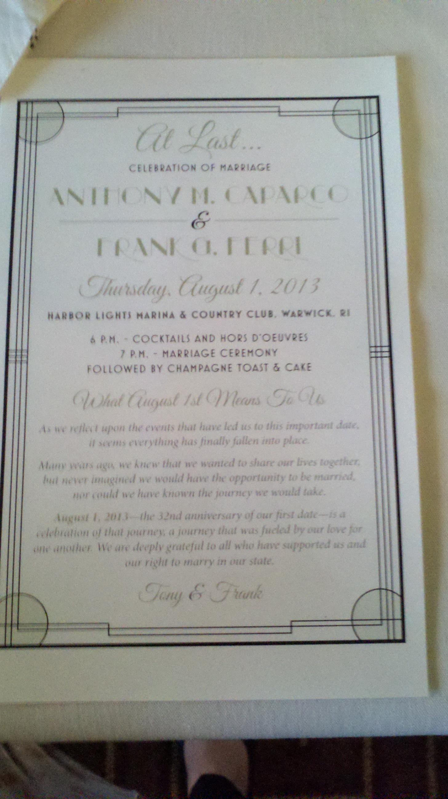 That evening, Representative Frank Ferri married his partner of 32 years, Tony Caparco.